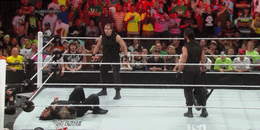Seth Rollins goes over to Triple H and Randy Orton. Rollins hands Orton the chair. Orton proceeds to beat Roman Reigns down with the chair.