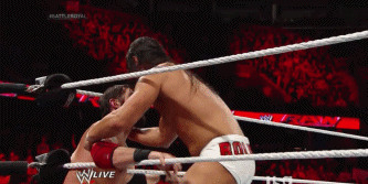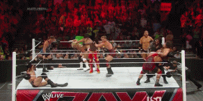 Roman Reigns knocks Bad News Barrett over the top rope. Bad News Barrett has been eliminated.