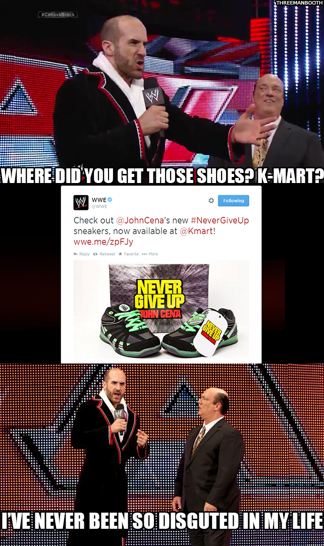 Cesaro mocks John Cena’s sneakers and asks if he got them at KMart, then tells Cena that you can’t wrestle in sneakers. Cesaro changes his mind and says Cena can’t wrestle period. Cesaro wants to prove that Cena can’t wrestle in a match right now.