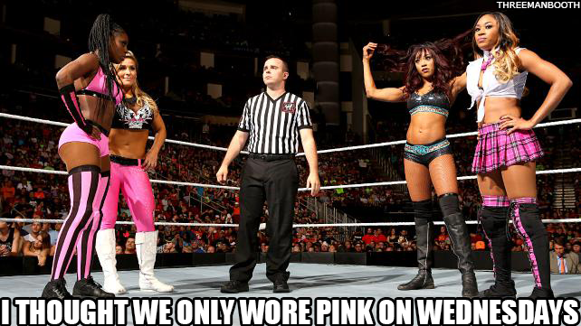 Backstage: Stephanie McMahon knocks on Nikki Bella’s locker room. Stephanie asks for Brie Bella, but Nikki tells her that she’ll be there. Stephanie hopes Brie will be reasonable, but Nikki tells her that there’s not a lot of times that people eat a plate of crap, and hopes Steph likes the taste of it.