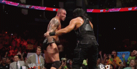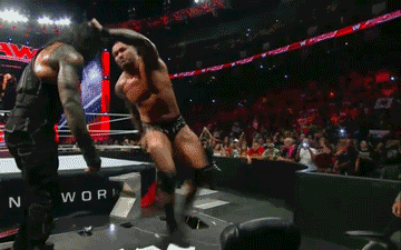 Randy Orton hits the RKO on Roman Reigns on the table….again.