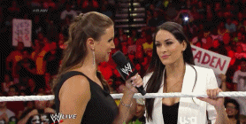Stephanie McMahon continues to talk, but Brie Bella comes through the crowd and interrupts.