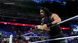 Seth Rollins tries to attack Roman Reigns with the Money In The Bank Briefcase, but Roman Reigns quickly knocks him down. Seth Rollins demands his briefcase back, so Reigns throws it at him.