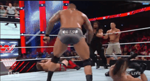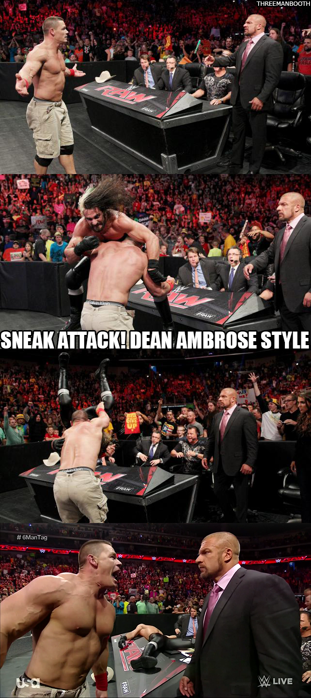 Post-Match, John Cena taunts The Authority. Seth Rollins tries to attack him, but Cena hits him with the AA on the table.
