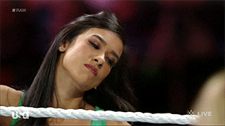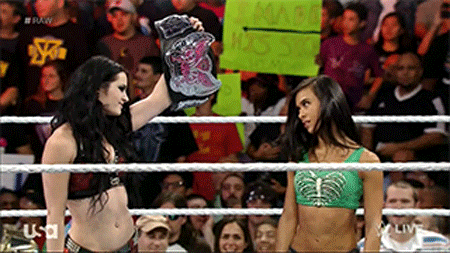 Post Match, AJ Lee and Paige argue. Paige tells AJ Lee not to touch her title, but AJ Lee decides to kiss the belt. AJ hands the title back to Paige, and Paige kisses the title next.