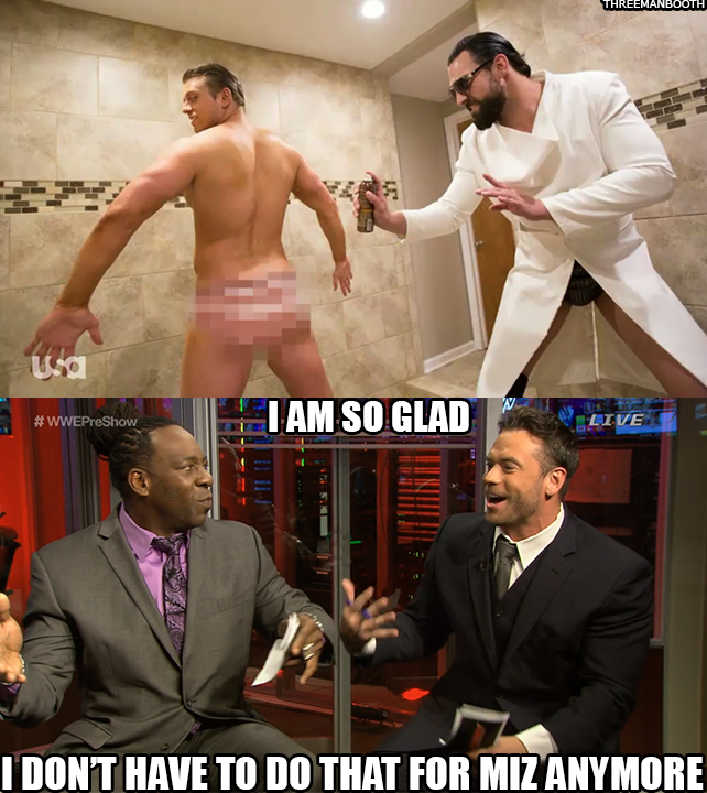 Dolph Ziggler is about to show the next photo, but he is interrupted by The Miz. The Miz claims that his photos were for medical purposes and promises that if Dolph Ziggler shows the photos, he will never work in this town again.