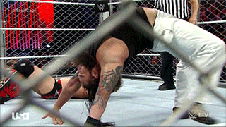 Chris Jericho’s knee is injured, but Jericho keeps trying to wrestle. Bray Wyatt goes over Chris Jericho to try and escape the cage.