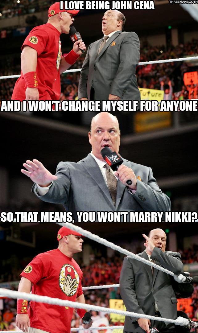 After John Cena doesn’t join in, Heyman does a “You Can’t See Me” and does a short freestyle rap to the guy in the 6th Row.