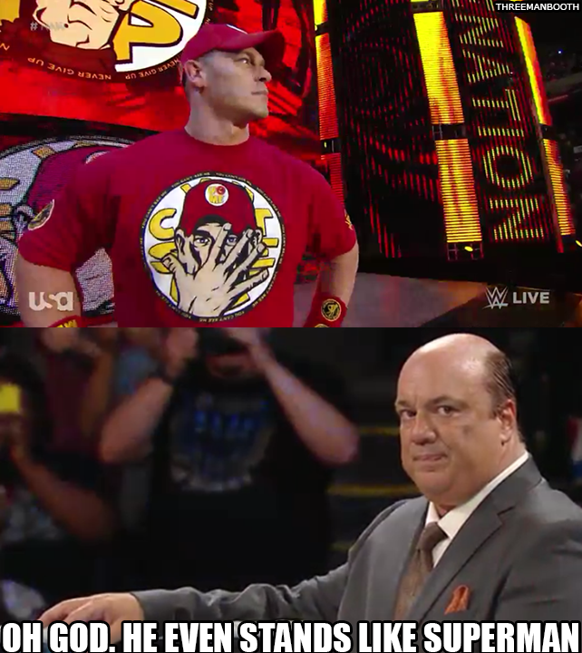 John Cena tells Paul Heyman that he likes being the guy who makes the kid do his homework early so he can come to RAW with his Dad. Cena doesn’t mind being the guy, who has Fathers who don’t like him, thank him for being a good influence on their kids.