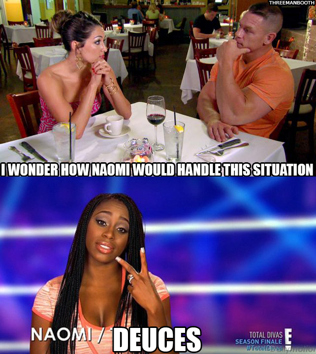 C’mon, fellas. That better be out of respect for the union of Brie and Daniel Bryan. The same better be true for Naomi. Her marriage to Jimmy Uso aside, Naomi is the Booth’s pick. She’s an amazing athlete who is, in our opinion, a future WWE Divas Champion. Plus, based on Total Divas, Naomi / Trinity is a complete professional both in and out of the ring.