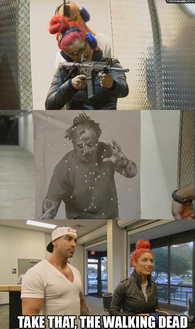 Jonathan tries to talk to the Gun Shop Owner about handguns vs. ARs, which Eva Marie is not okay with because she wants no guns in her house.