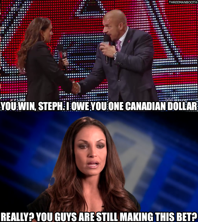 Triple H says Stephanie McMahon won the belt and gives Stephanie a dollar.