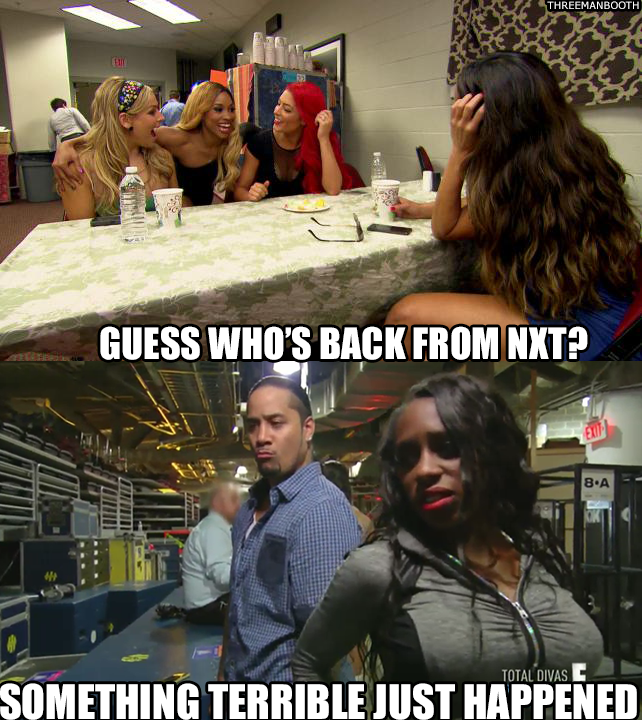 So, listen, guys. As much as we loved doing two recaps (RAW and Total Divas), E! switched the Total Divas format to 2 episodes on Sunday. One recap is easy. Two recaps. Not so much. THREE recaps?! That’s why we don’t have an NXT or a TNA iMPACT: So That Happened…So, welcome to the new format for the Total Divas Recap from now on. It’s a lot easier on all of us, and we hope you understand. It’ll still feature the same tweets and memes, just shorter.