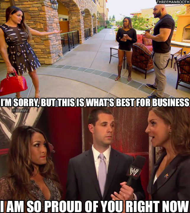 Eva Marie agrees to be wear white for the wedding. Eva tells the other Divas about her Father’s cancer, being terminal and spreading. The Divas are shocked because her Father looks so lively and well. Later, The Bella Twins, specifically Brie, tries to get Eva Marie to talk it out, but Eva doesn’t want to do this, especially at work.