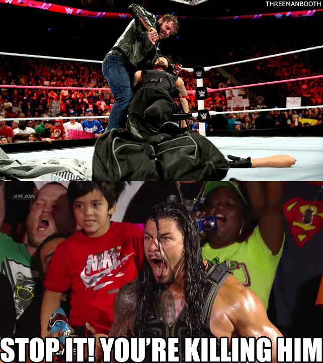 After Foley leaves, Dean Ambrose tries to attack Seth Rollins with a chair, but Seth Rollins dodges. Dean Ambrose hits Seth Rollins with the dummy, then throws the dummy at Rollins.