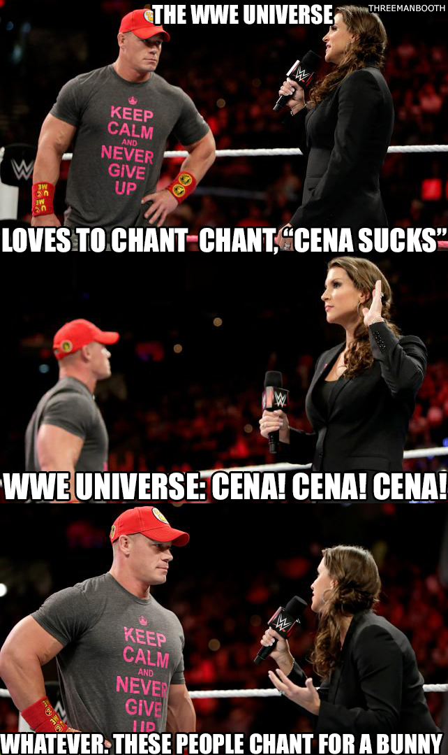 Stephanie McMahon asks John Cena if he hears when the people chant “Cena Sucks.” Stephanie tries to continue her proposition, but gets cut off by a “Cena” chant. Stephanie mocks how moving that is for John Cena, then reminds Cena that most of the time, they’re rooting against him.