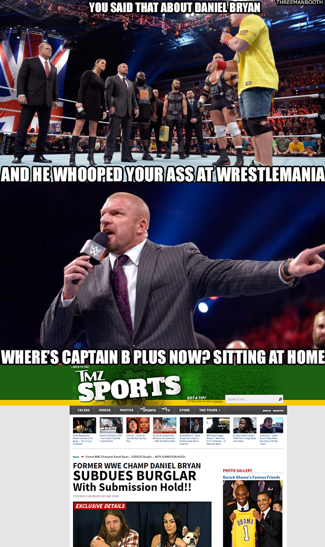 After a loud “YES” Chant, Triple H calls Daniel Bryan “Captain B+” and reminds the fans that he’s injured and sitting a home doing nothing.