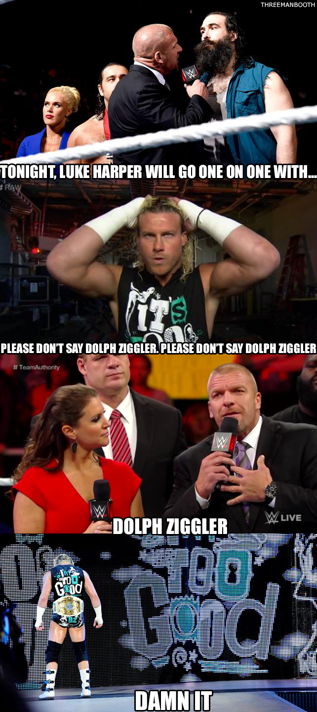Triple H turns his attention to everyone else in Team Cena, saying their decimation begins now. Triple H puts Luke Harper in a match against Dolph Ziggler for the Intercontinental Title. Triple H mocks John Cena’s catchphrase, saying that Ziggler’s Time Is Up and that Harper’s Time Is Now.