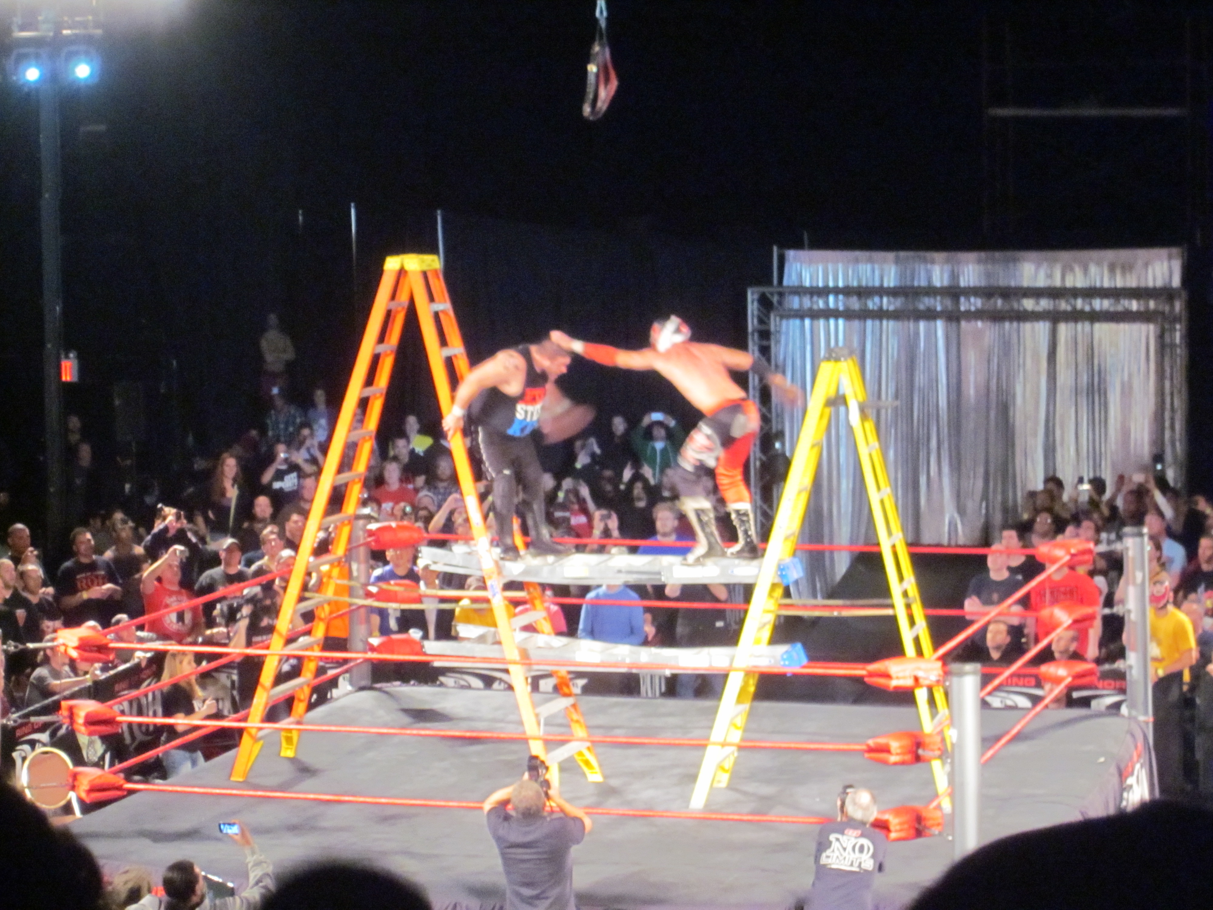 Using 4 Ladders, Steen and Generico constructed and double “table” to help them reach the title belt that swung overhead. Their design was also the biggest moment of the match.