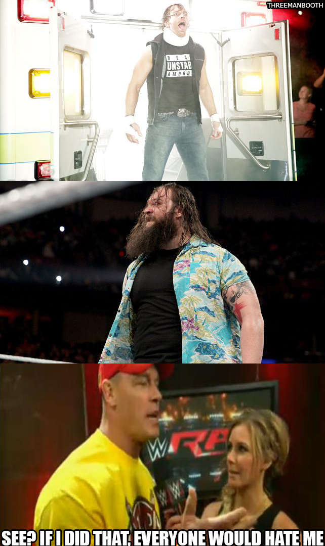 Bray Wyatt came out to deliver a message to Dean Ambrose about breaking Sister Abigail’s Rocking Chair, then brags about injuring Dean Ambrose’s trachea on Smackdown.