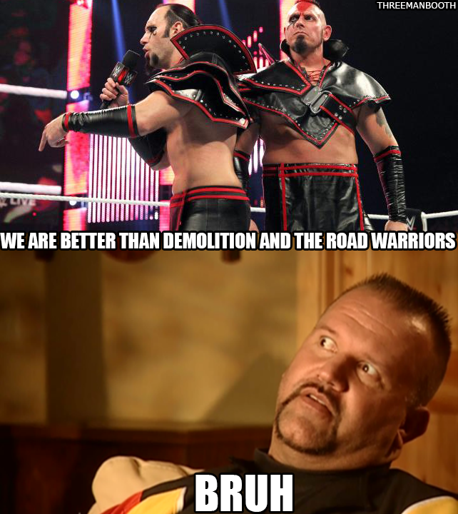 The Ascension bring up Ax and Smash of Demolition, saying they’d destroy Demolition and The Road Warriors, saying they’d throw them off the road. The Ascension mocks the Road Warrior’s “What A Rush” catchphrase, then says “What A Joke.” The Ascension tells the WWE Universe to Welcome To The Wasteland.