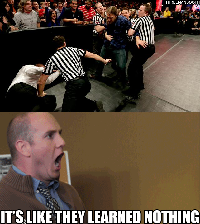 After Daniel Bryan declines, Stephanie reminds Daniel Bryan of him winning the WWE World Heavyweight Title and then his whole world crashing down. Stephanie shows the footage of Kane destroying Daniel Bryan.