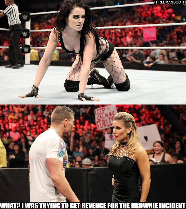 Tyson Kidd accidentally distracts Paige, allowing Brie Bella to win.