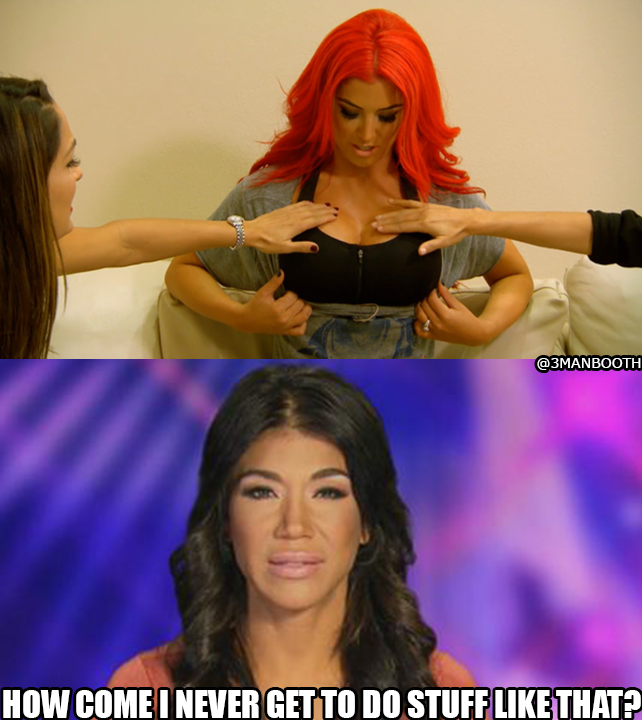 Total Divas begins with Eva Marie getting a visit from The Bella Twins. The Bella Twins feel up Eva Marie’s boobs, saying they look brand new. Jonathan politely asks The Bella Twins to stop groping his wife.