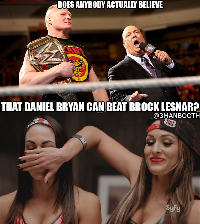 Paul Heyman says Daniel Bryan has lied to himself thinking he has a chance against Brock Lesnar. Heyman asks the WWE Universe if Bryan has a chance against Lesnar. After a mixed reaction, Heyman praises Daniel Bryan’s wrestling and technical abilities and says Bryan has found a way to pull of miracles that even he and Lesnar couldn’t do. Heyman asks the WWE Unvierse again about Daniel Bryan and if he is the one to beat the one in 21-1 and is met with another mixed reaction.