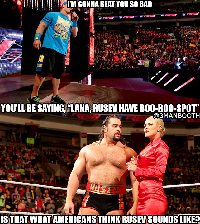 John Cena says Rusev’s got jokes, but Lana’s got the balls. Cena tells Rusev if he’s feeling froggy, jump.