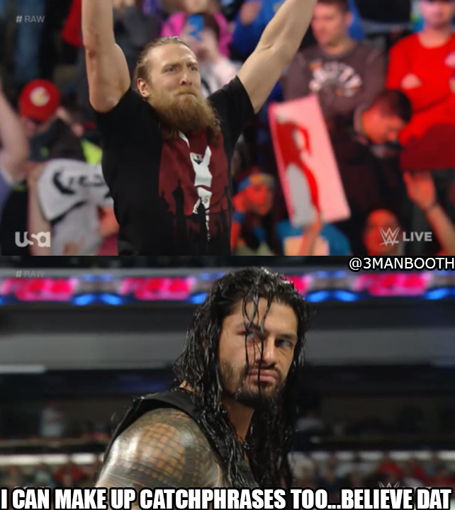 Daniel Bryan pushes Roman Reigns. Roman Reigns spears Daniel Bryan.
