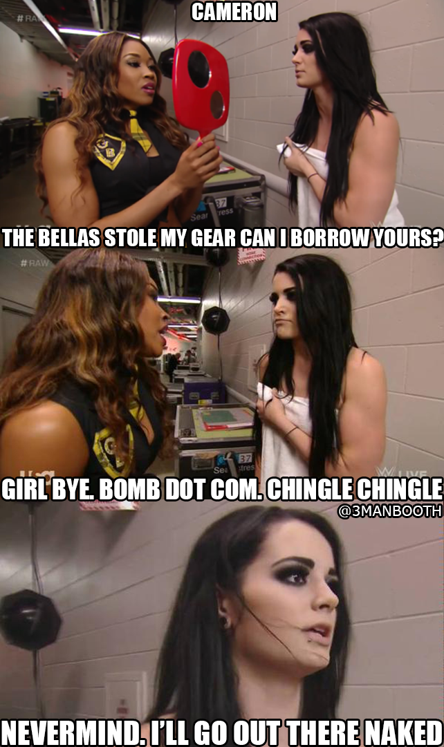 Backstage: Byron Saxton tries to get a word with Paige, but The Bella Twins are seen running out of the Divas Locker Room with Paige’s gear.
