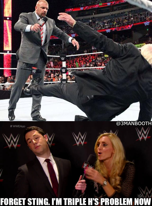 Triple H says there is nothing more important than his wife and kids outside of the WWE. Triple H says Sting is not going to ruin this for him and if someone tries to stand between him and WWE, he is kicking their ass. Triple H says where Sting leaves on his own or Triple H beats it out of him, Sting will never show his face here again.