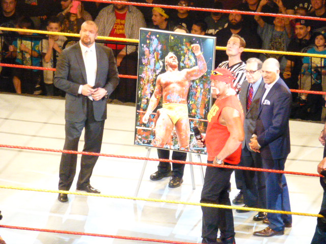 When legends of professional wrestling meet like this in the ring, who knows what could happen? Actually, these two icons showed their mutual respect for each other, recounting moments in both their professional and personal lives. To keep the surprises coming, Triple H appeared with some members from Madison Square Garden: a Senior VP and a long time Archivist/Photographer presented Hogan with 2 items to commemorate the event. The first was a photo from Hogan during the height of Hulkamania: