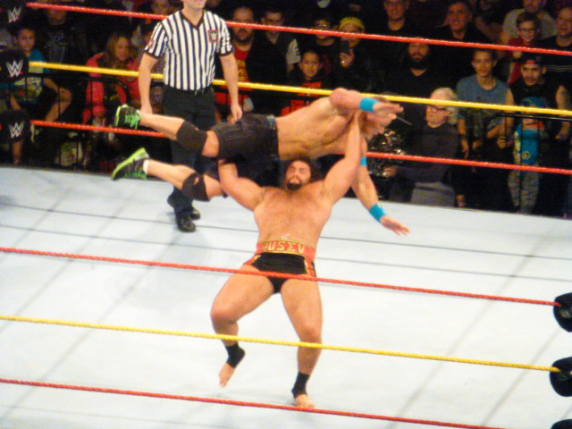 Rusev was supposed to defend his US Championship but after learning that his opponent was John Cena, Rusev (and Lana) opted to not put the title on the line. Fortunately for the MSG Universe, Triple H, in his role as Chief Operating Officer, made Rusev defend his title. It was a hard hitting contest that saw Cena and Rusev try to take each other out. Rusev’s strength is deceptive. He was able to catch John Cena mid flying cross-body and counter it into a fall away slam!