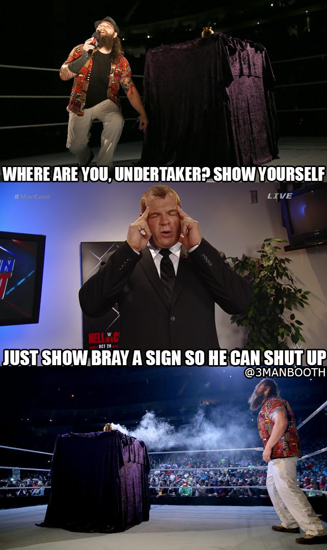 A sign appears on the titantron, telling Bray Wyatt “The Man Come Around.” The Undertaker’s voice is heard saying, “You Will Rest In Peace.”