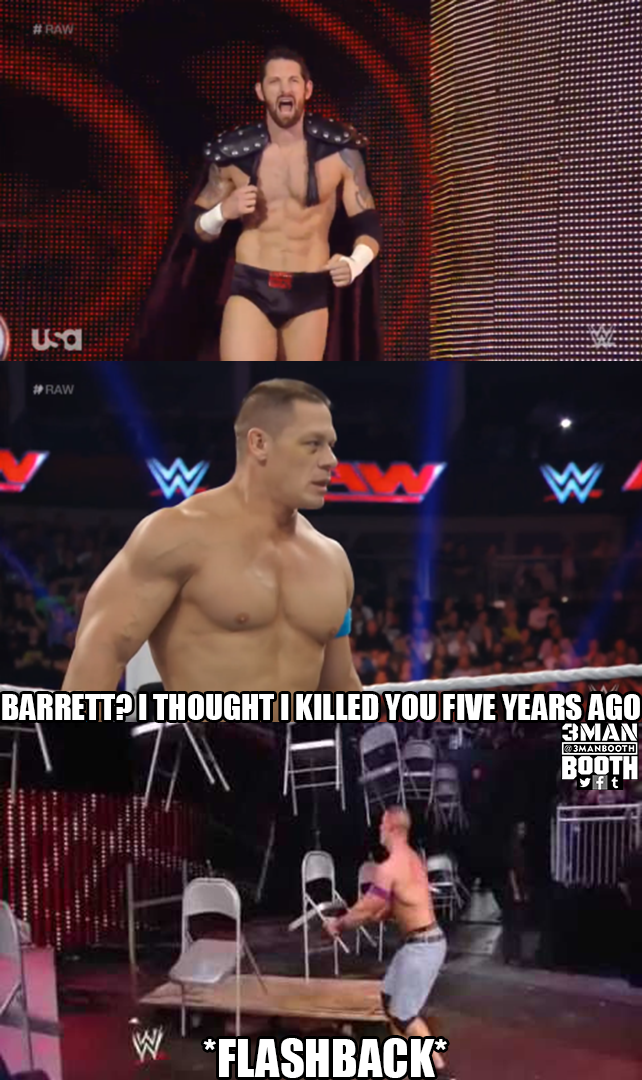 John Cena catches Bad News Barrett with the Springboard Stunner into the AA.
