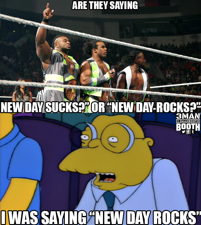 Xavier Woods tries to lead the WWE Universe in a new clap. The New Day starts chanting “New. Day. Rocks” but the fans keep chanting “New. Day. Sucks.”