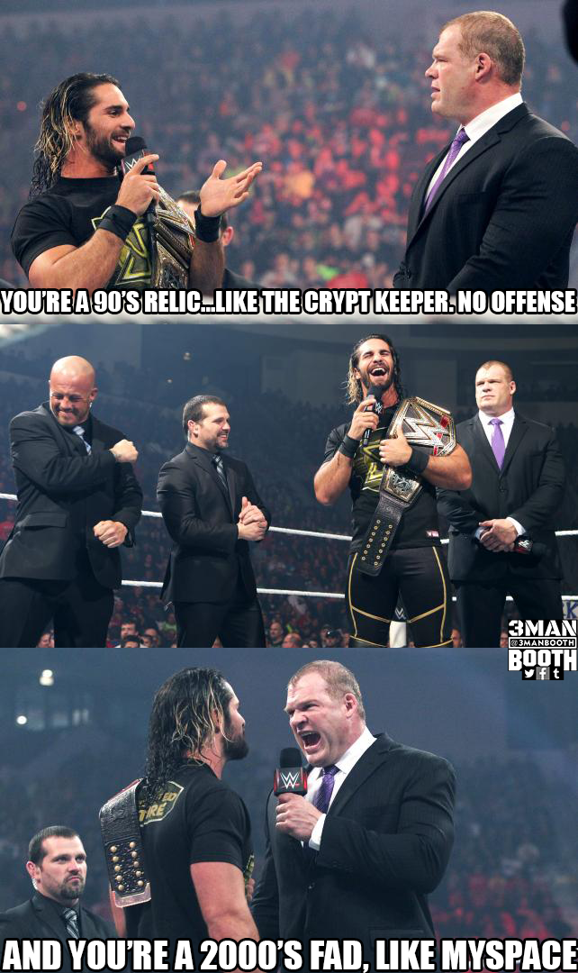 Seth Rollins thanks Kane for doing what was Best For Business, saying he did his best as the crypt keeper. Rollins apologizes saying the Crypt keeper is a face from the 90s that no one cares about.