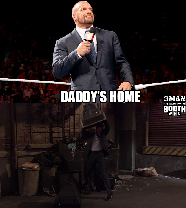 Triple H says “Daddy’s Home.” Triple H says he says that to his children when he comes home, and immediately they behave better.