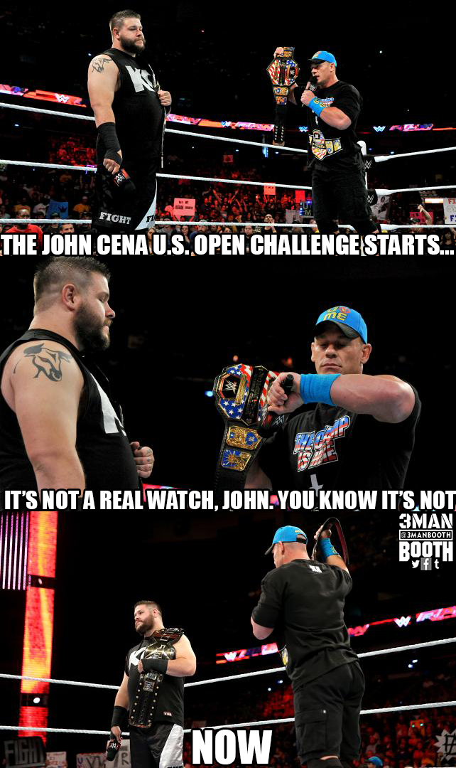 John Cena says Kevin Owens has a great idea with the NXT Title Open Challenge, saying that will be the first time the NXT Title is defended on RAW. Cena accepts Kevin Owens challenge.