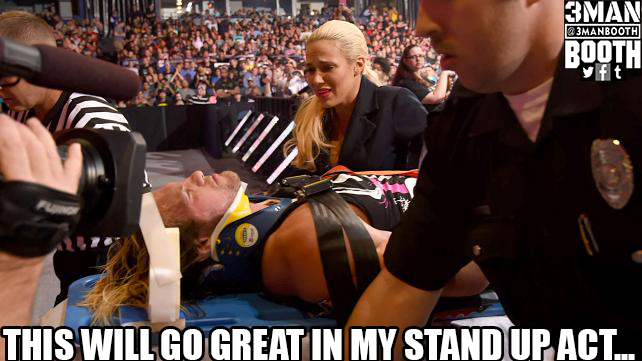 Bray Wyatt’s music plays. Bray Wyatt starts to come down to the ring, but Roman Reigns hits Bray with a Superman Punch.