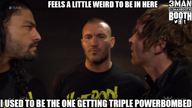 Randy Orton tells Dean Ambrose and Roman Reigns that whatever they want to do tonight is fine, just leave #ScumbagSheamus to him. Orton walks off as Ambrose tells Reigns that Orton finally has a good attitude.