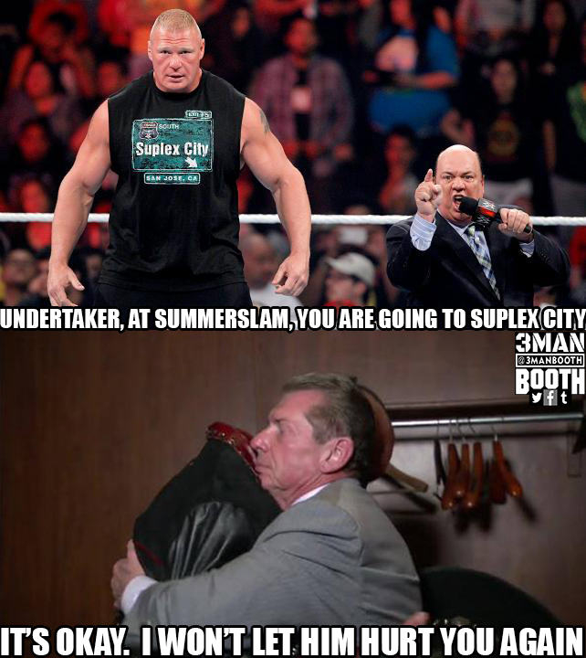 Paul Heyman says at Battleground, The Undertaker forced WWE’s hand by picking a fight with Brock Lesnar and left WWE no option to make this fight for Summerslam. Heyman says the fight could’ve happened in a parking lot, a church or hell itself. Heyman says August 23rd, Summerslam 2015, it’s “The Match Too Big For Wrestlemania.”
