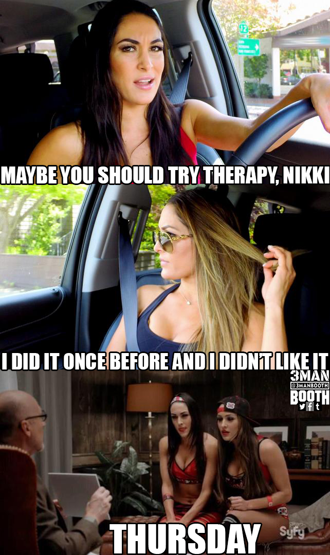 Nikki still canโt get out of her head โ sheโs worried about her upcoming PPV match โ so Brie keeps suggesting therapy.