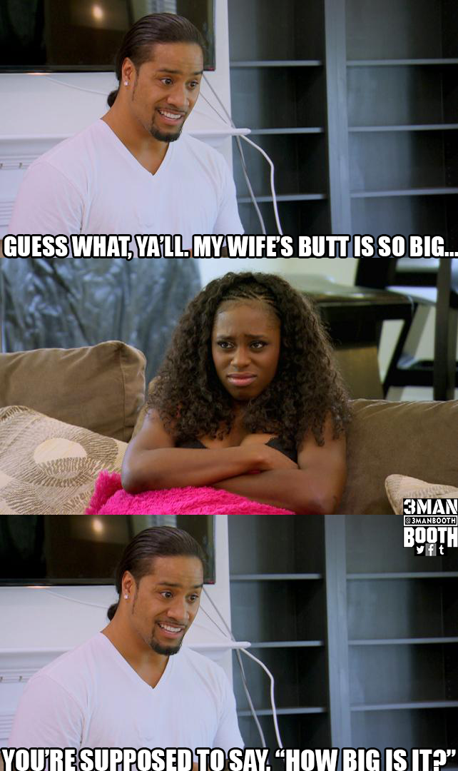 At home, Naomi wants Jimmy Uso to try out some of his material on her and her Dad. While Jimmy gets ready, Naomi and her Dad decide that the best way to make Jimmy feel comfortable is to be in their underwear, like the public speaking tip: “Imagine everyone in their underwear.” FYI: Don’t do this. It’s a myth. It doesn’t work.