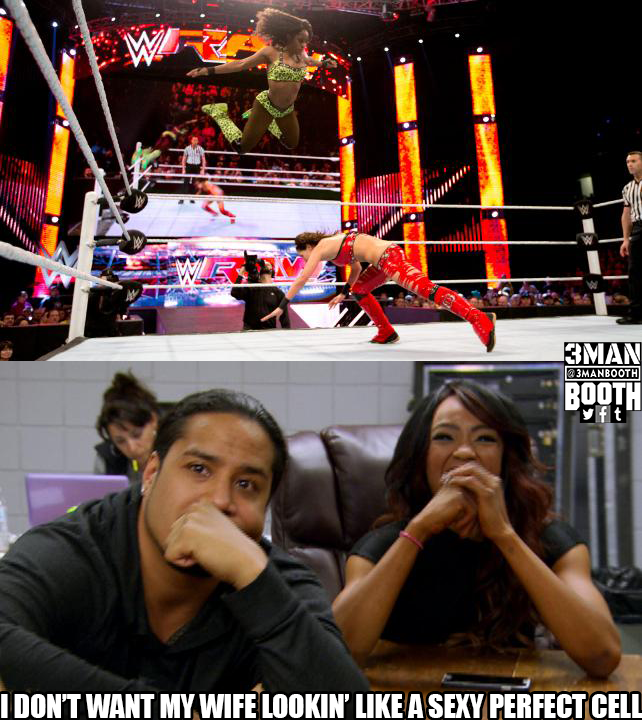 Backstage pre-Mexico, Jimmy Uso joins the Divas to watch Naomi’s match with Brie. While the Divas are talking about how cute Naomi’s outfit is, Jimmy thinks it is too revealing, especially when paired with Naomi’s new butt-centric offense.