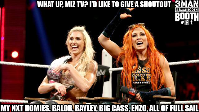 The Miz tries to bring up the last time Team PCB was at MizTV, but Becky Lynch quickly shuts Miz down for being a sexist, chauvinistic pig. Becky threatens to slap Mizβs attire off of him. Miz corrects Becky saying itβs an βInfinity Scarf.β