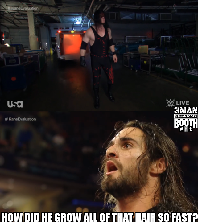 Before Ashley from HR can get started, Seth Rollins interrupts and tells Ashley that Kane is not the person he’s claiming to be, then shows a video clip of Kane’s demonic ways.