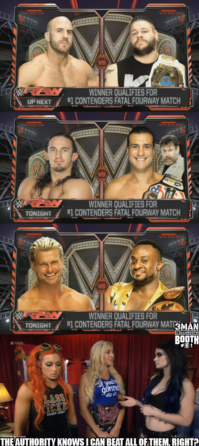 After the praise was over, The Authority announced a series of matches tonight featuring the non-Brock Lesnar winners from Hell In A Cell. The matches are Roman Reigns vs. Kofi Kingston, Cesaro vs Kevin Owens, Neville vs Alberto De Rio and Dolph Ziggler vs. Big E. The winner of those matches will go on to face each other in a Fatal-4-Way to determine the number one contender for Seth Rollins’ World Heavyweight Championship.